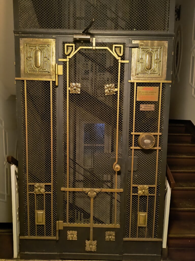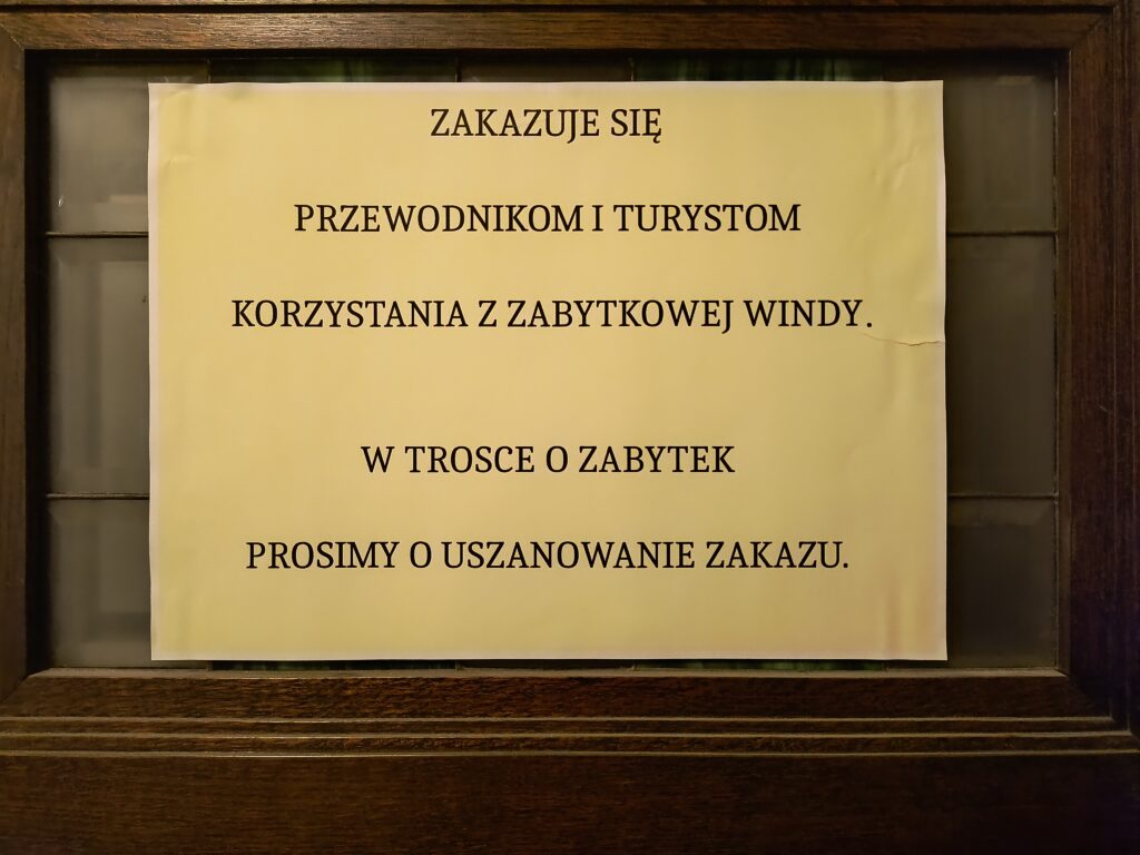 Na szczęście zachowana została oryginalna winda! Okazuje się, że były zakusy, aby ją ze względów technicznych usunąć. Jest! I chwała tym, którzy ją uratowali! Naprawdę budzi zachwyt. Nie tylko dla myśli technicznej sprzed przeszło stu laty, ale też dla artyzmu kowala, który nadał jej wymiar dzieła sztuki. Zwróćmy uwagę na zakaz. Uszanujmy prośbę. to będzie nasz wkład w troskę nad zabytkiem.